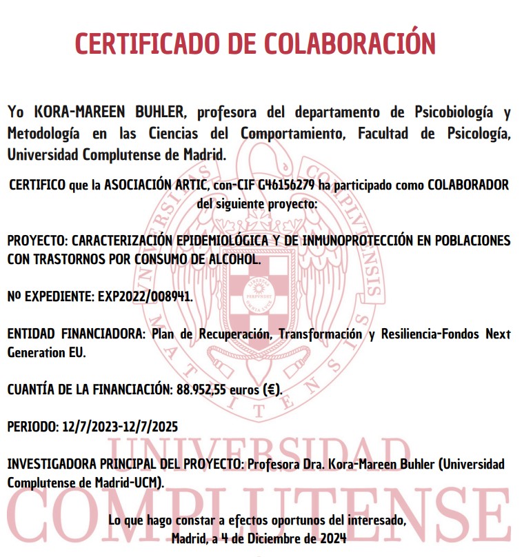 Hemos terminado el 2024 con la oportunidad de colaborar con la Profesora y Dra. Kora-Mareen Buhler en Psicobiología y Metodología en las Ciencias del comportamiento y junto a todo su equipo, en el proyecto que están llevando a cabo de caracterización epidemiológica y de inmunoprotección en poblaciones con trastornos por consumo de alcohol.